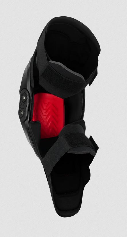 - Das integrierte Doppelgelenksystem der oberen und unteren Rahmen folgt der natürlichen Kniebewegung und hält den Protektor während der Fahrt optimal in Position.