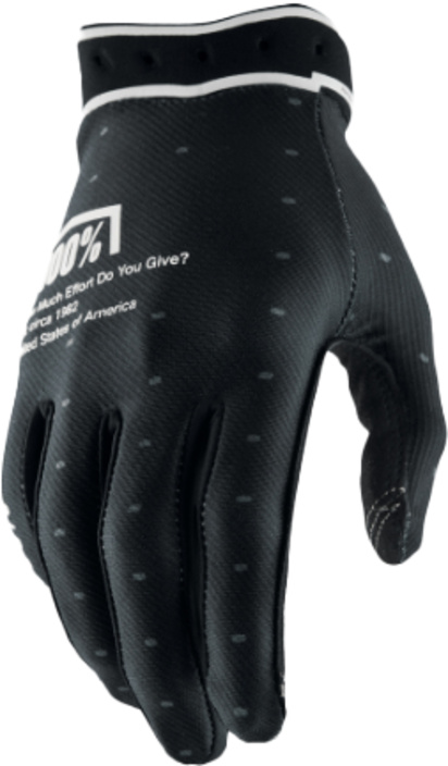 Der Ridefit Handschuh von 100% ist ein sehr leichter, hochwertiger und technisch bis ins Detail entwickelter MX- und MTB-Handschuh für alle Einsatzzwecke. Das einlagige, perforierte Stretch-Clarino bietet hohen Komfort und Haltbarkeit. Am Daumen schützt eine 3mm Schaumstoff Polsterung vor Blasenbildung. Airprene an den Handgelenksbündchen und am Daumen bieten maximalen Schutz bei gleichzeitiger Belüftung. Der Klettverschluss am Handgelenk ermöglicht passgenauen Sitz und individuelle Einstellbarkeit. Das dünne Material auf dem Handrücken fördert die Luftzirkulation und leitet überschüssige Feuchtigkeit ab. Auf der Handinnenfläche und an den Finderspitzen bringen die Silikondrucke mehr Grip am Lenker und an den Brems- / Schalthebeln.